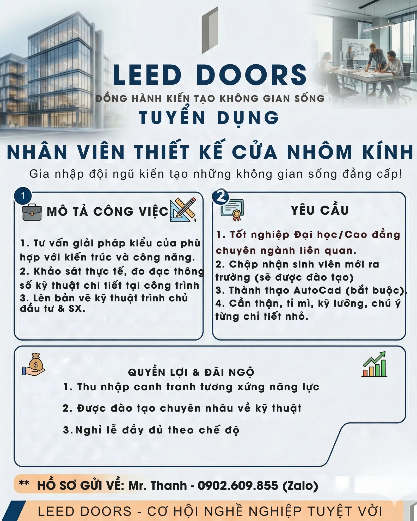 Leed Doors là đơn vị uy tín trong lĩnh vực cung cấp và lắp đặt các giải pháp cửa nhôm kính cao cấp. Để đáp ứng nhu cầu mở rộng thị trường và mang đến những thiết kế tối ưu nhất cho khách hàng, chúng tôi đang tìm kiếm những cộng sự tài năng cho vị trí Nhân viên Thiết kế.
